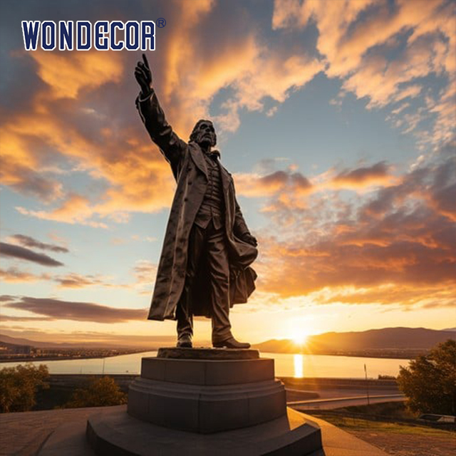 As the day draws to a close, the sun dips below the horizon, casting a warm, golden glow across the sky. A statue, frozen in time, reaches out as if to capture the last few rays of sunlight. This silhouette against the fiery backdrop of the setting sun creates a moment of stillness and beauty. The sculpture, detailed and prominent, stands as an enduring symbol, perhaps commemorating a historical figure or moment, while nature's spectacle unfolds behind it.